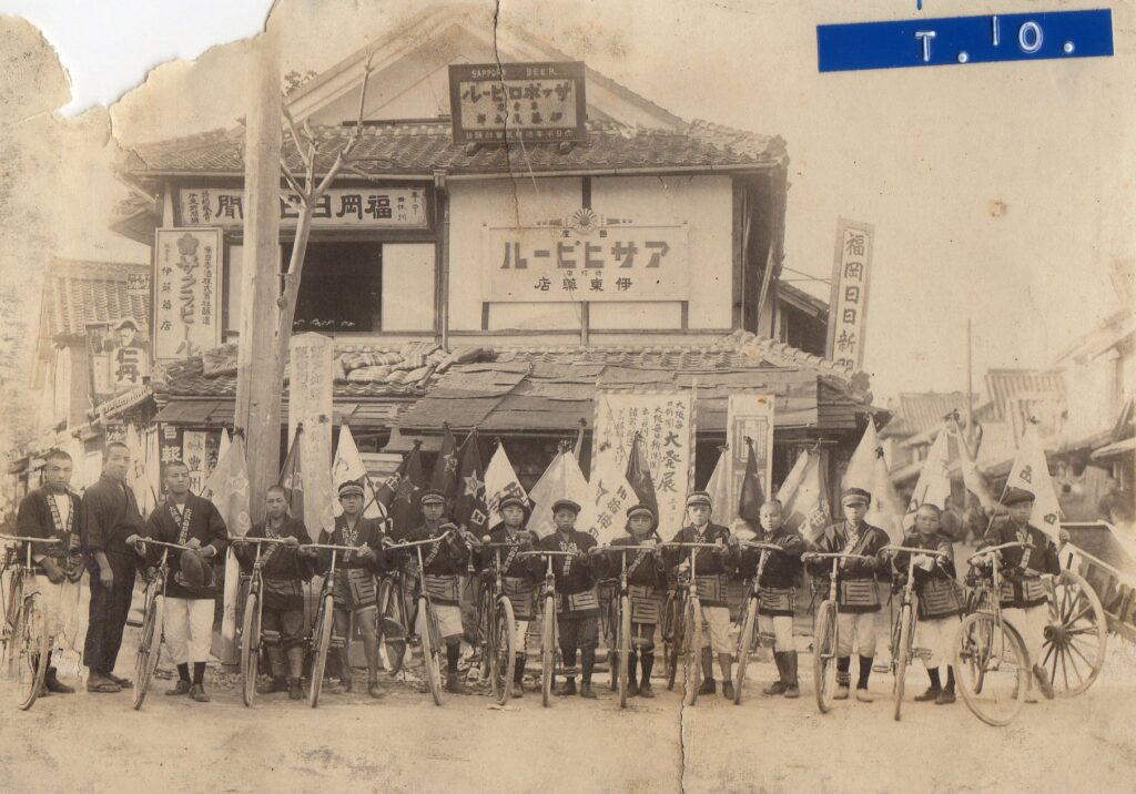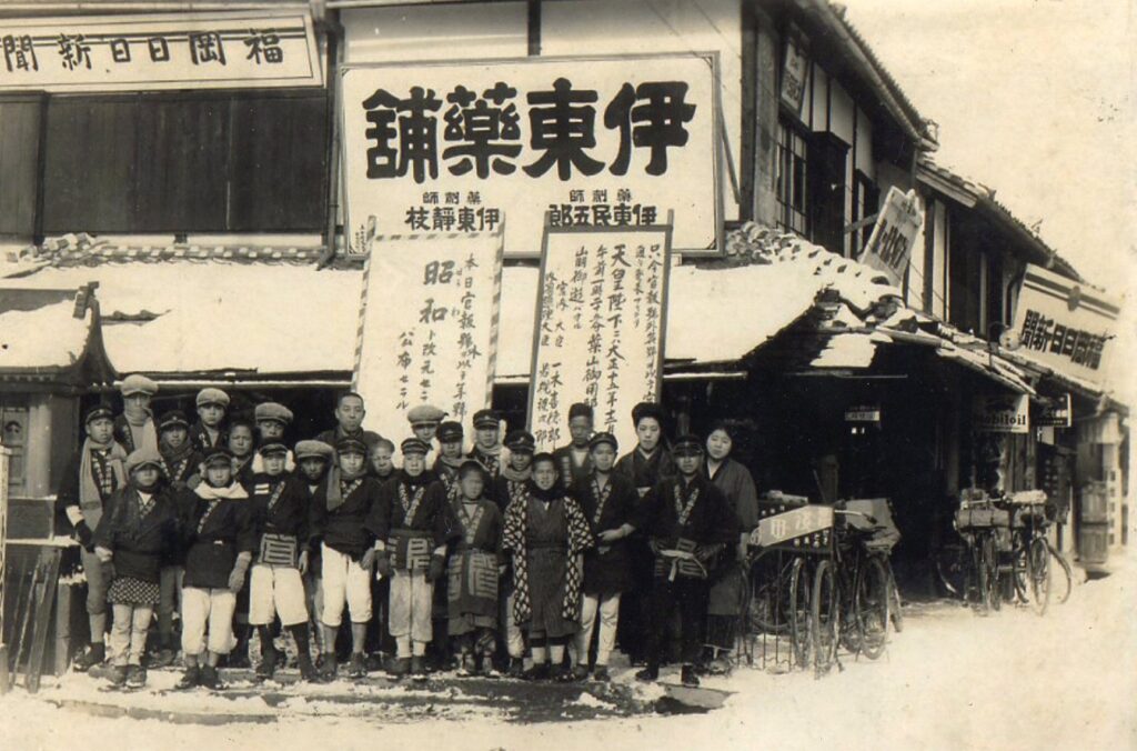 伊東薬局は、明治37年2月8日、日田市隈町にて開局いたしました。この日は日露戦争が開戦した日とも言われています。現存する最古の写真は翌年、明治38年に撮影されたもので、『バルチック艦隊全滅』という看板が掲げられています。当時、同じ場所で新聞販売店も営んでいたため、世の中のニュースを掲示していたようです。
